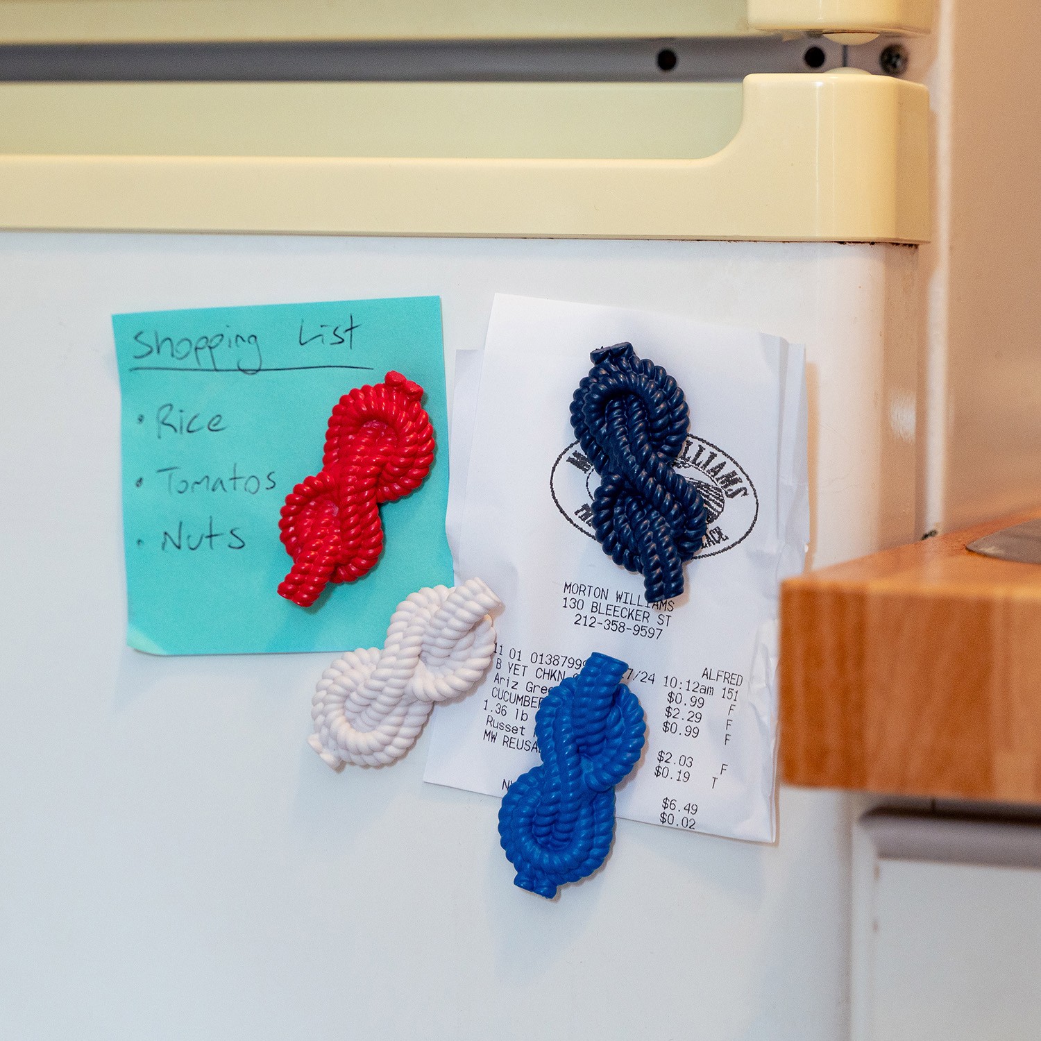 In certi casi però i gadget vi vengono incontro e vi offrono la possibilità di usare dei perfetti nodi marinari a prescindere dal vostro livello di competenza. Difatti non si tratta di vere cime o di nodi da imparare, i Magneti Nodi marinari sono un set che ha solo le forme di un tipico nodo da marinai.