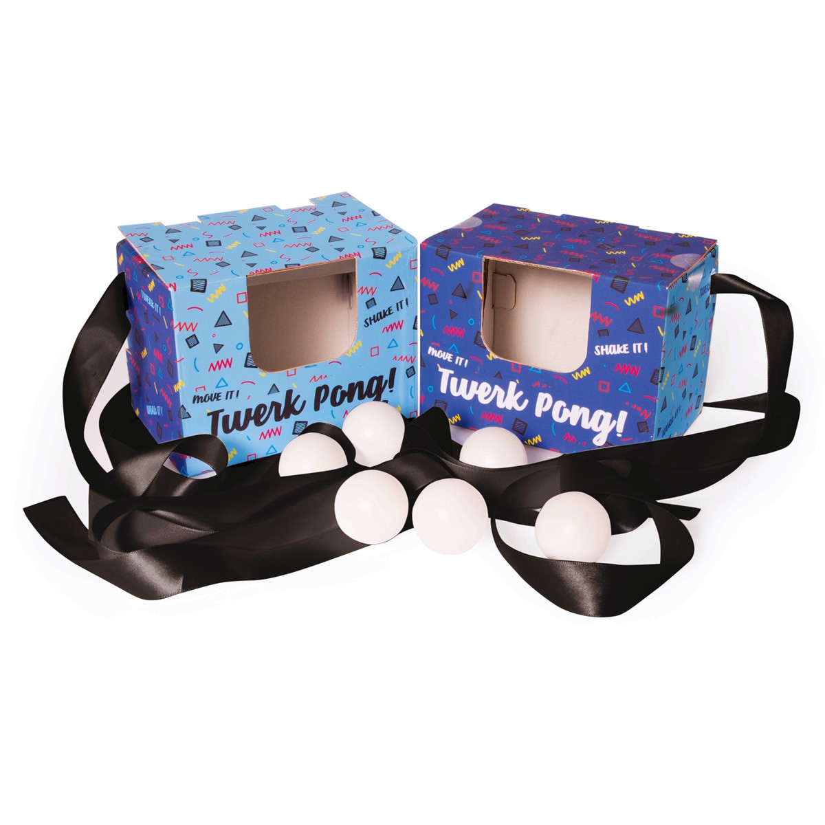 Il Twerk Pong è un gioco per party che crea sul ballo un passatempo geniale e divertente. Il set per giocare include due scatolette in cartone dotate di una cintura per poterle mettere in vita, più delle palline da ping-pong.