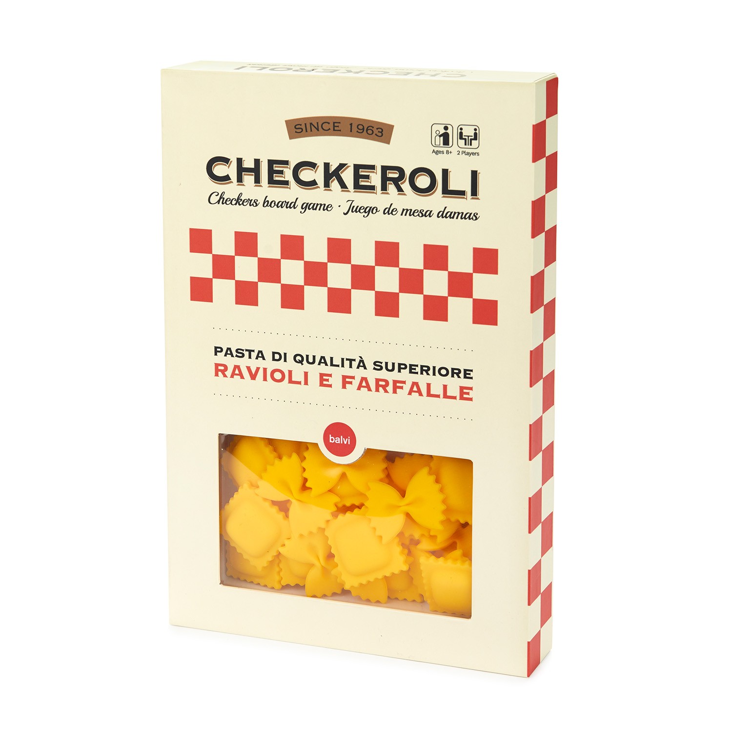 La Dama Checkeroli è una versione alternativa della dama che stravolge il design dei pezzi. Al posto dei classici dischi bianchi e neri ci sono due formati differenti di pasta. Per rappresentare la pasta secca ci sono le farfalle mentre per la pasta fresca ci sono i ravioli.